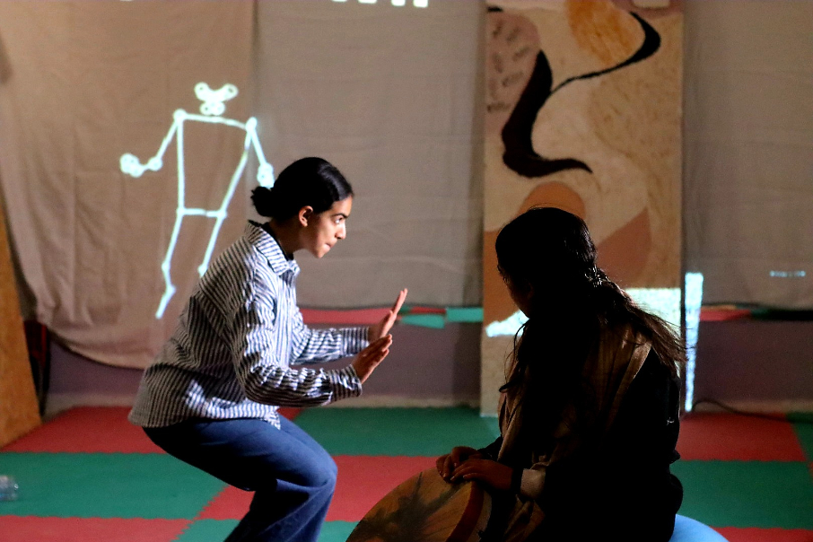 Encadrés par trois artistes intervenants, les 15 jeunes sont répartis en petits groupes pour expérimenter chaque pratique et contribuer à la réalisation d’une œuvre collective. Travaille des matières, peintures et objets volumétriques pour créer un triptyque inspiré par la thématique du sable. Manipulation de boîtes interactives conçues pour l’atelier et de logiciel de mapping pour générer et projeter des textures vidéo. Pratique musicale avec l’utilisation d’instruments traditionnels modifiés et augmentés ainsi que de captation de sons du quotidien pour créer une composition sonore jouée en direct.